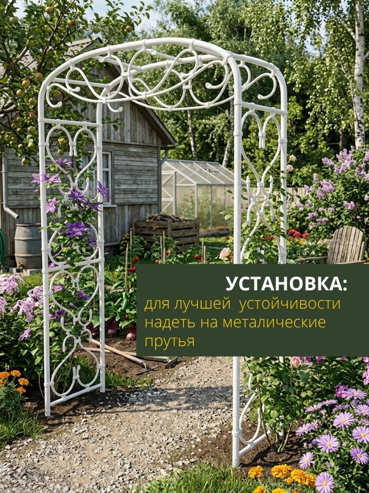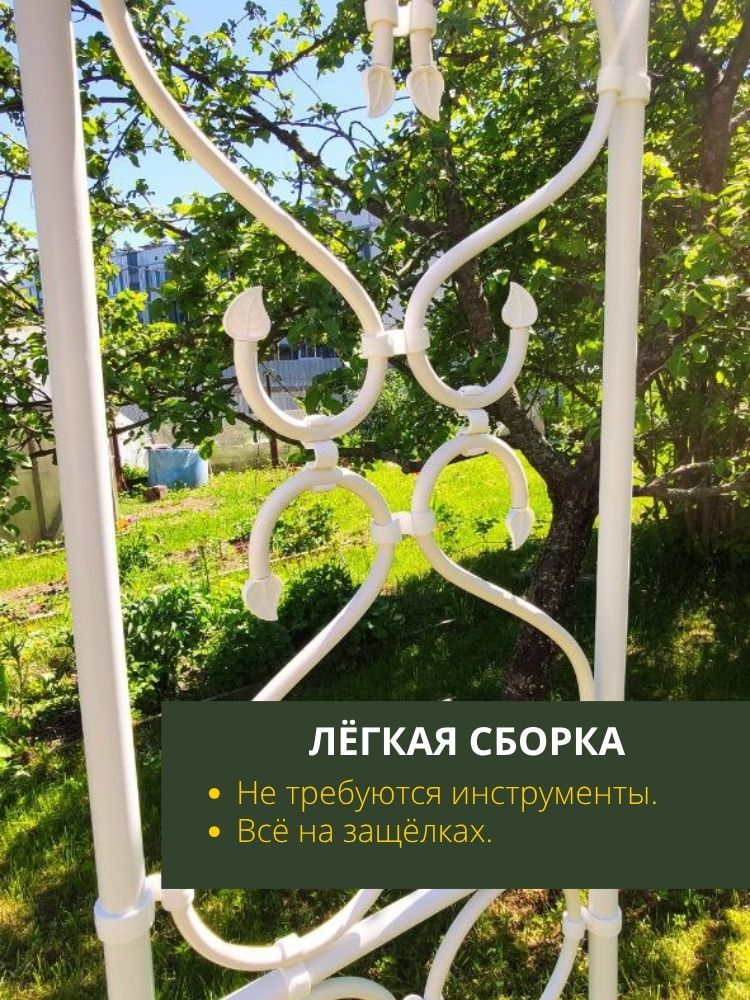 2. Простота и прочность конструкции Забудьте про заваливающийся от легкого дуновения ветра садовый декор! Наши арки сконструированы так, что их можно собирать и разбирать легко и просто сколько угодно раз! В конструкции не предусмотрено ни одного самореза - все на защелках (не нужно никакого постороннего инструмента)! Собранное изделие крепко стоит на любой поверхности и создает впечатление основательной, монументальной конструкции. Арки выдерживают любую нагрузку, по ним можно пускать даже виноградные лозы!