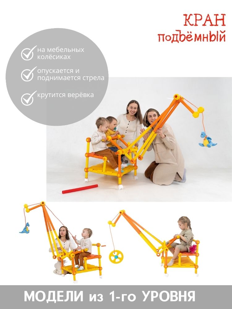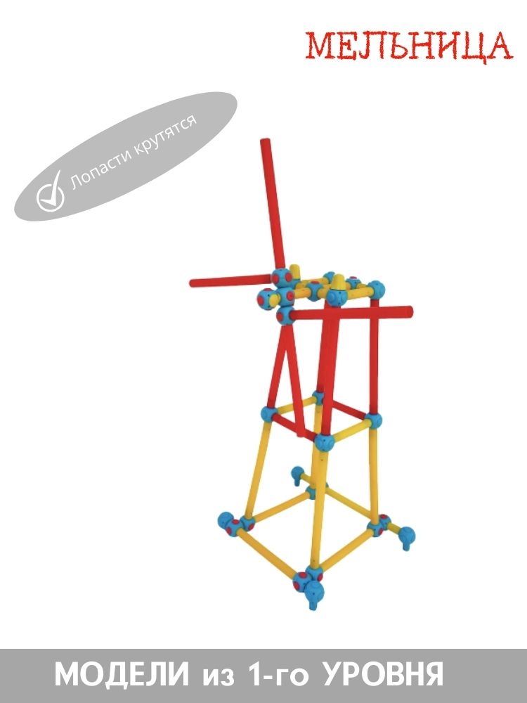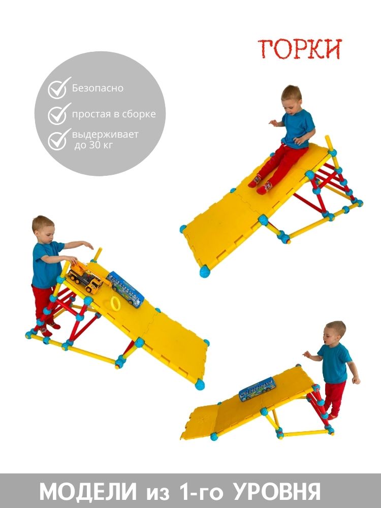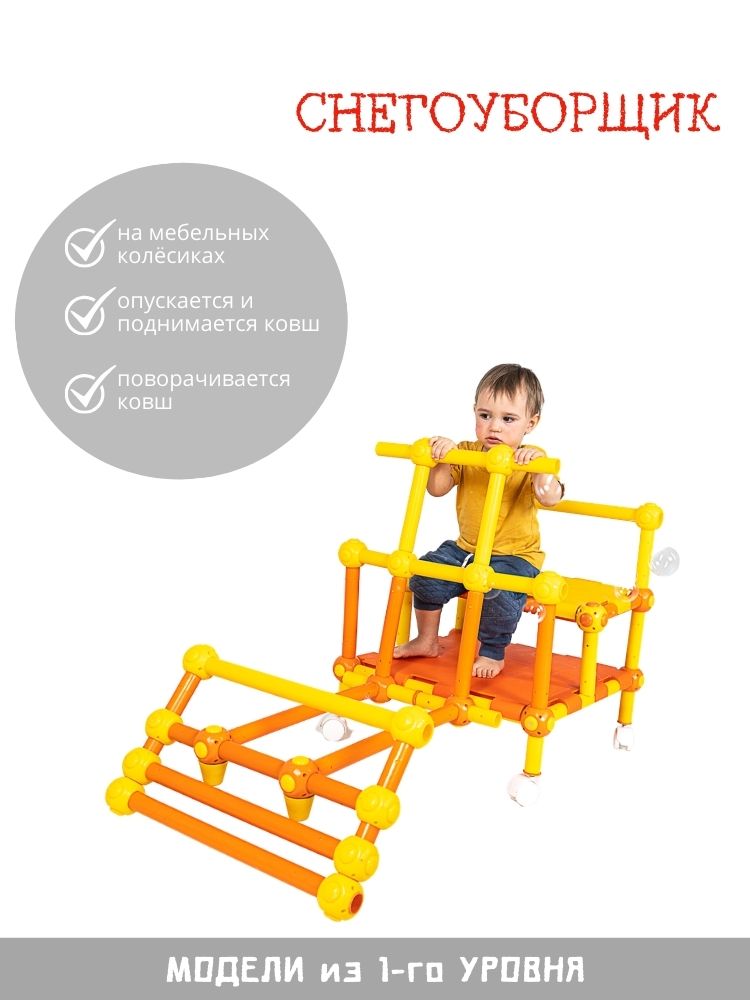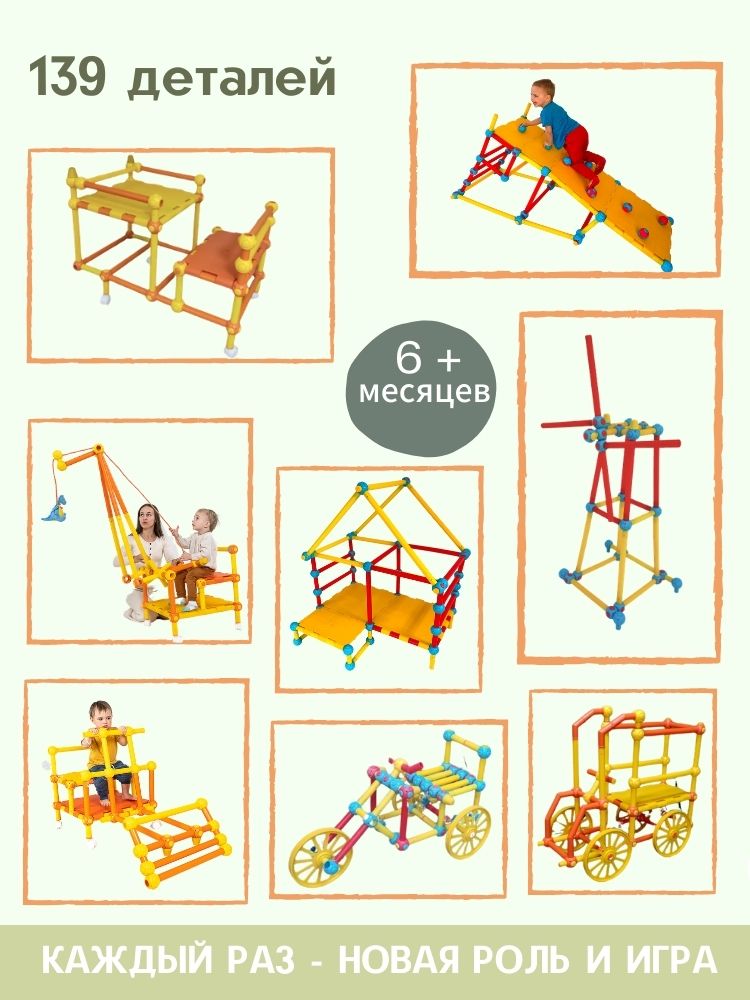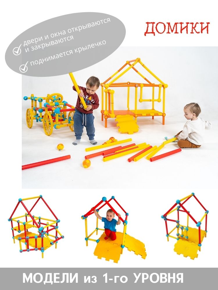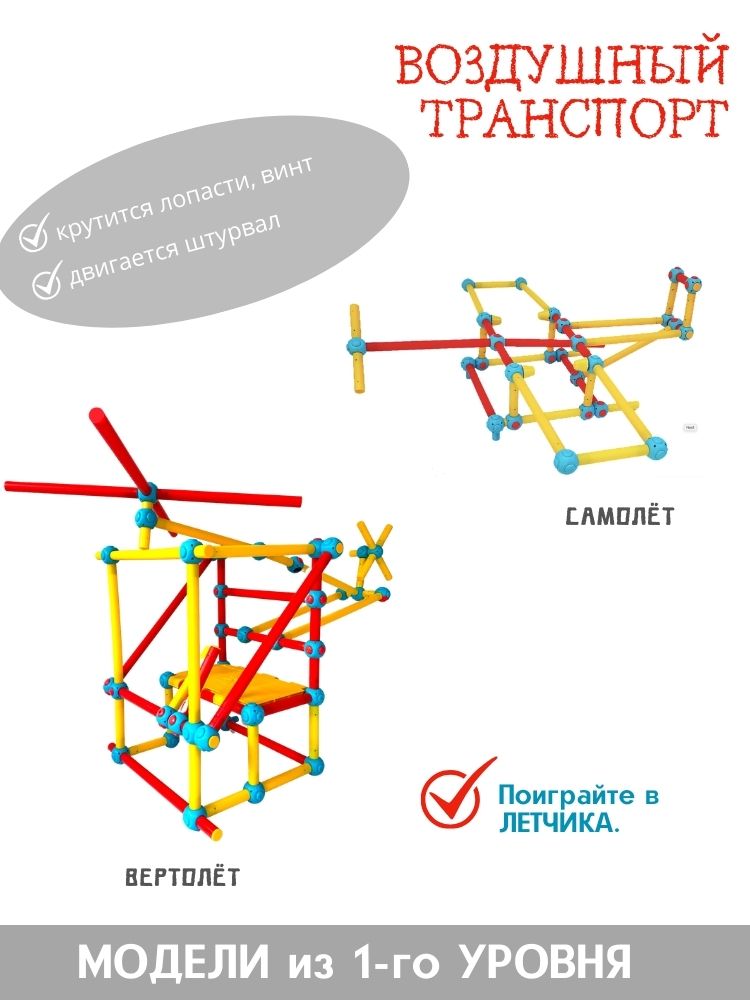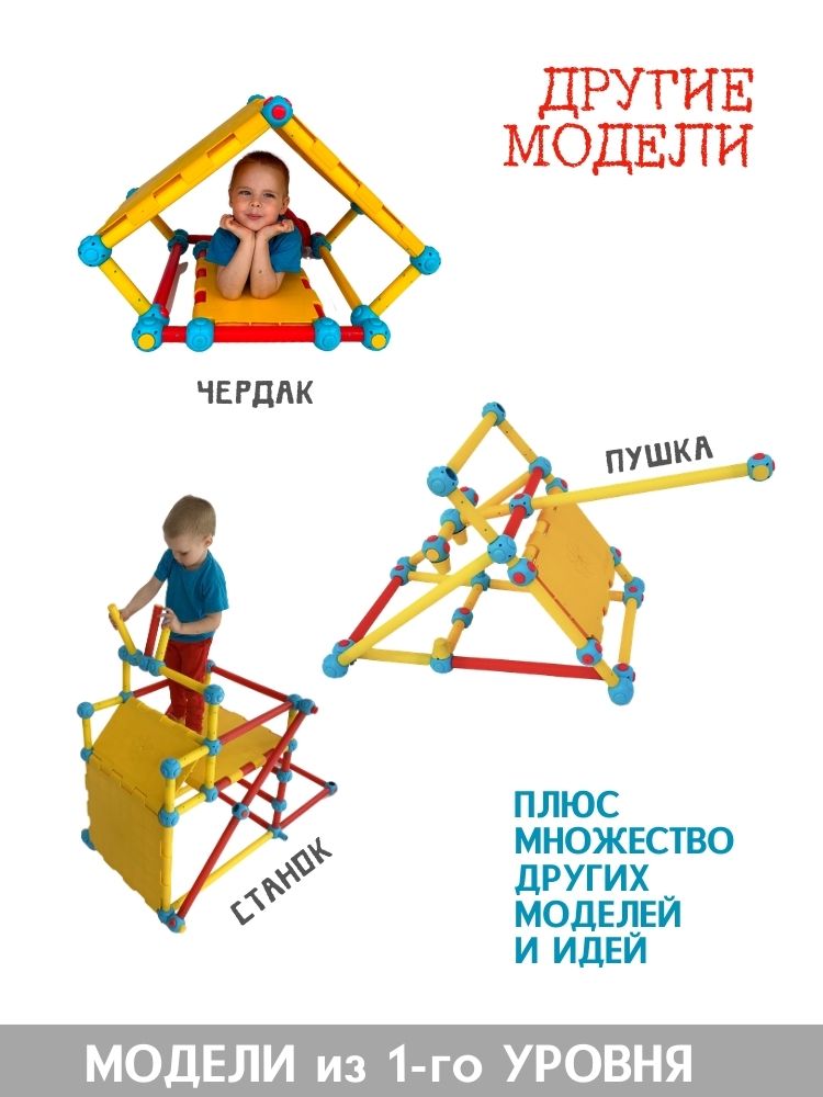 - Набор пластиковых трубок и соединяющих узлов позволит собрать десятки вариантов моделей от трактора до самолёта, от различных горок и мостиков до домиков и мебели.