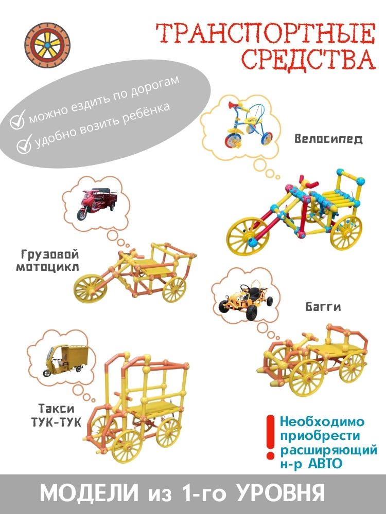 - Приобретая расширяющий набор "АВТО" можно собирать любые транспортные средства, на которых можно реально ездить и катать.