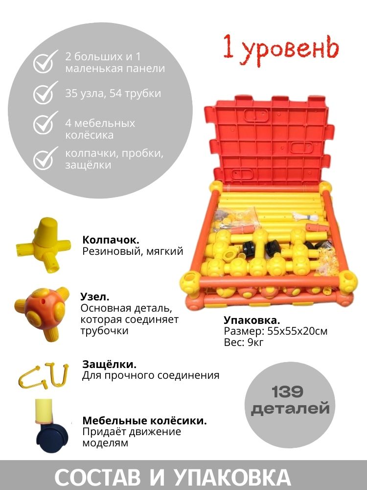 - 2 больших и 1 малая панель, 35 узла, 54 трубки, 4 мебельных колёсика, колпачки, защёлки и заглушки. Итого - 139 деталей