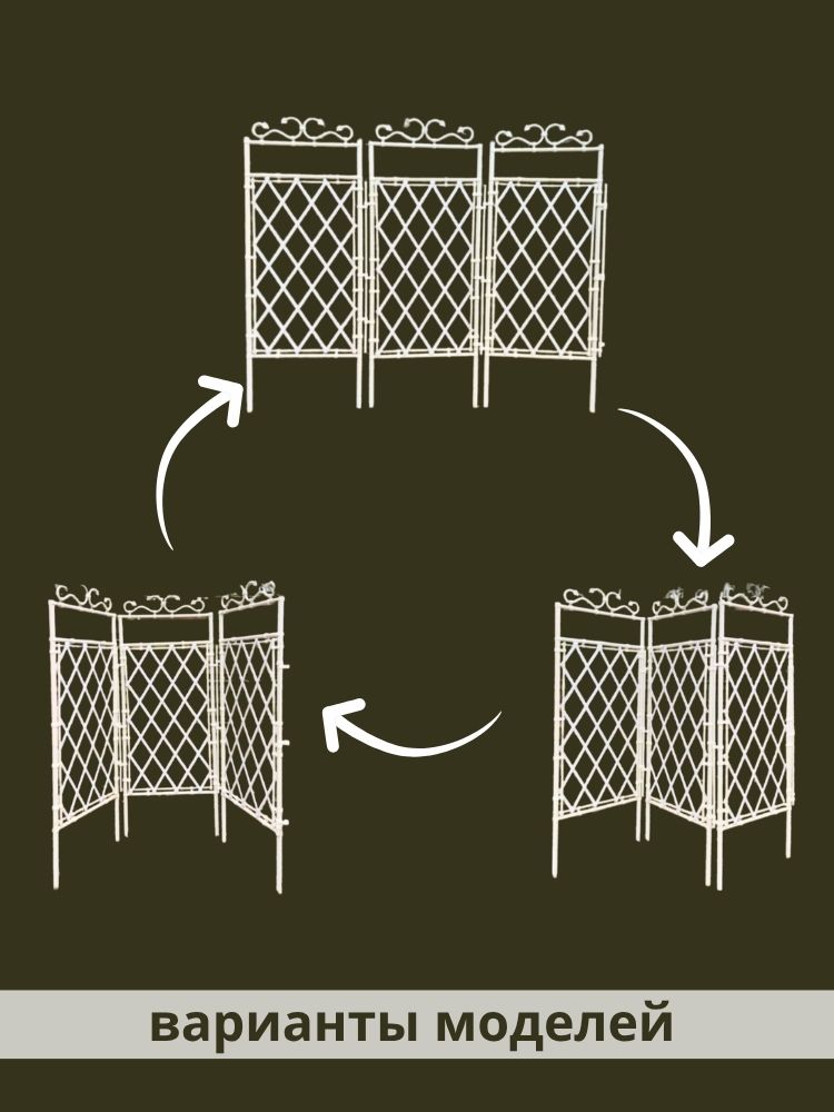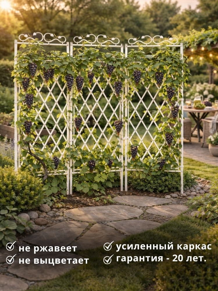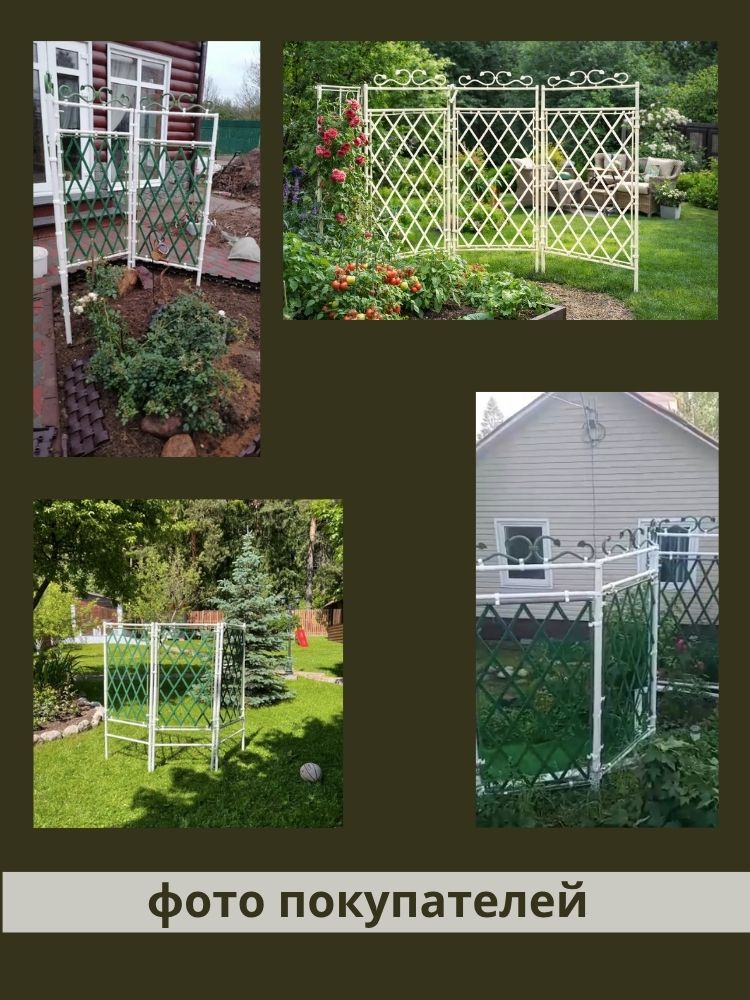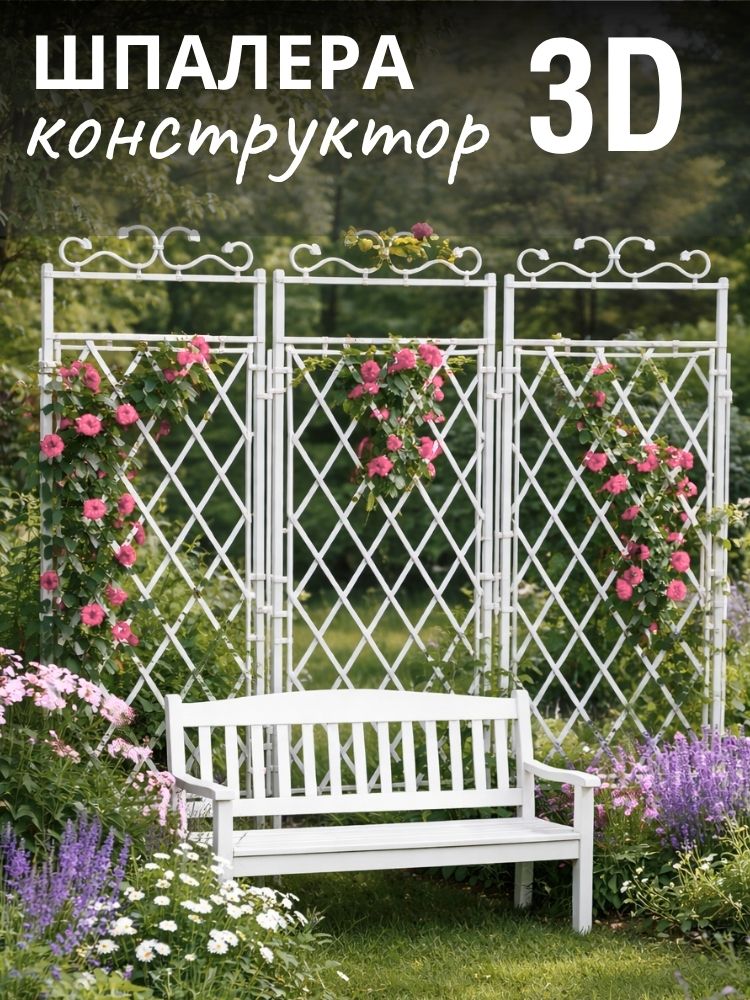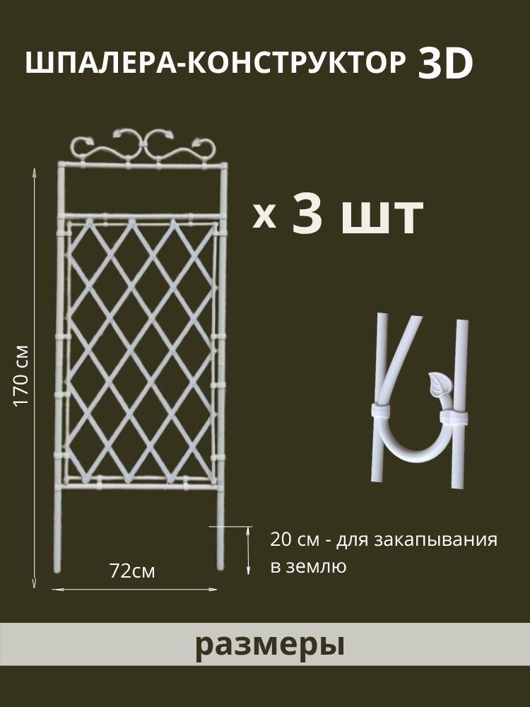 Шпалеры - конструктор 3D (опоры) для вьющихся растений от отечественной компании ГарденПласт, мгновенно преобразят ваш сад, участок и огород. В комплекте 3 одинаковые секции (1 секция = 180х70 см), которые можно устанавливать, как отдельно, так и вместе, соединенные между собой в различные формы (гармошка, ширма, треугольник). Каркас шпалер выполнен из труб ПВХ диам 32мм. Наши изделия выполнены из белого и зелёного пластика ПВХ, который остаётся неизменным многие годы и не требует никакого специального ухода (не выцветает, не ржавеет, не трескается, морозоустойчив, крепкий, лёгкий). Растения на таком пластике в жару не подгорают. Вся сборка на защелках, никаких саморезов, болтов и гаек. Для надёжности вбейте в землю арматуру или трубку и “наденьте” на них шпалеры. Идеальны под покраску.